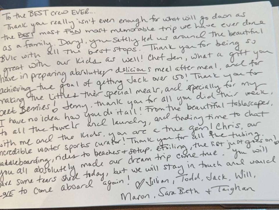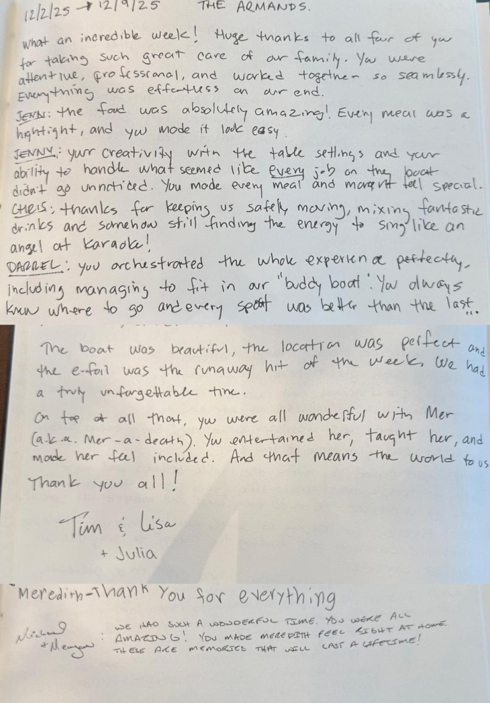 While we were looking forward to a fun and relaxing week, our time here was so much more. The ability to connect, relax, explore and share as a family has made for an unforgettable week. And it wouldn't be possible without such a wonderful yacht and fantastic team taking care of us. From a well thought out itinerary, a gracious welcome, exceptional food, numerous activities, the Dewitt/Yague/Perkins family would like to thank Darrel, Jenn, Remi and Jenny. Your attention and warmth took an experience that would have been great to truly exceptional. Thank you and I hope we visit again.