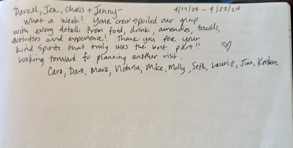 What an amazing week - we had high expectations for this trip and somehow you all managed to surpass our ideas in every area. The attention to detail and warm atmosphere - made this the best family vacation. Thank you for the delicious food, wonderful accommodations and care. We have had so many memories as a family this week- thanks so much for making this possible.